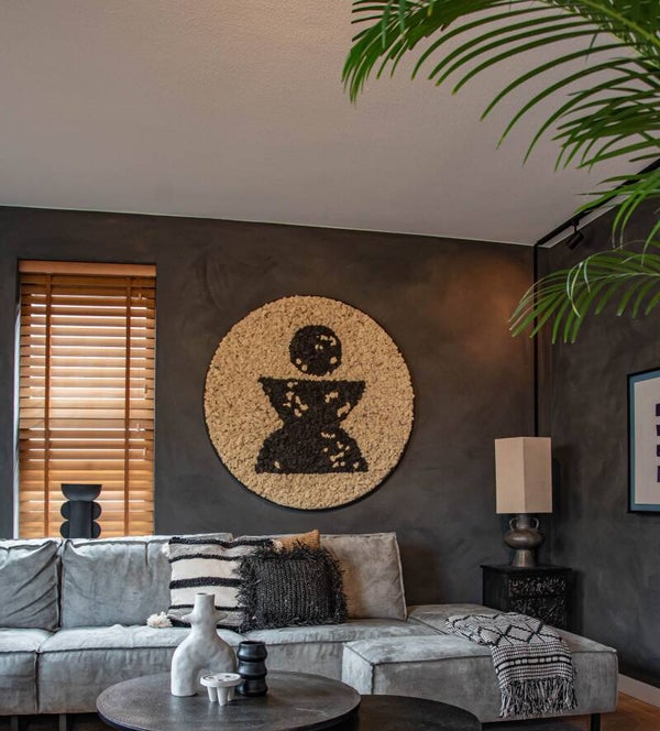 Zij koos deze moscirkel in boho/ abstracte vormen in naturel met zwart rendiermos. Deze kleuren passen bij hele veel stijlen en interieurlooks.