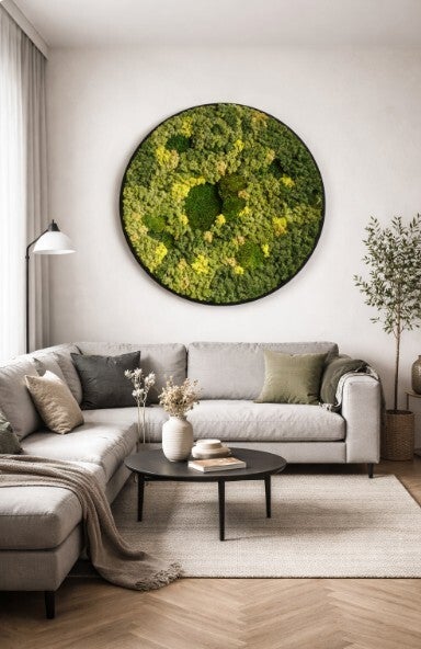 De cirkel is eenvoudig op te hangen aan een schroef, omdat de moscirkel dan ook mooi strak tegen de muur aan komt te hangen. Dan komt deze het mooist tot zijn recht.