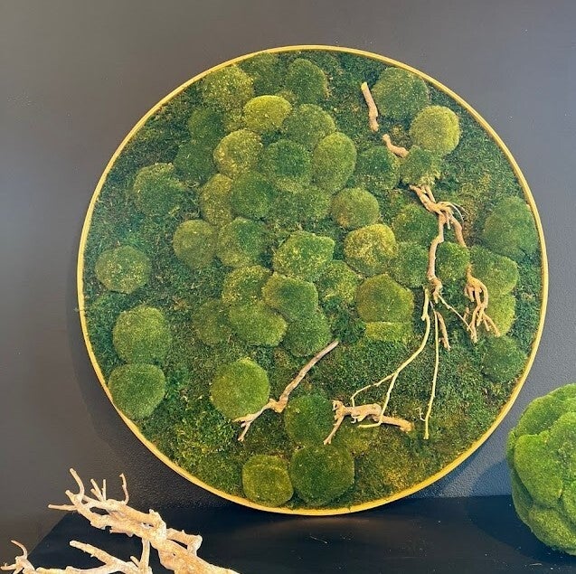 Prachtige rustieke moscirkel. Gevuld met plat en bolmos. Met rustieke takken erin verwerkt. Elke moscirkel is exclusief, gezien geen enkele mospluk maar zeker takken niet gelijk zijn. Dat maakt het extra mooi.