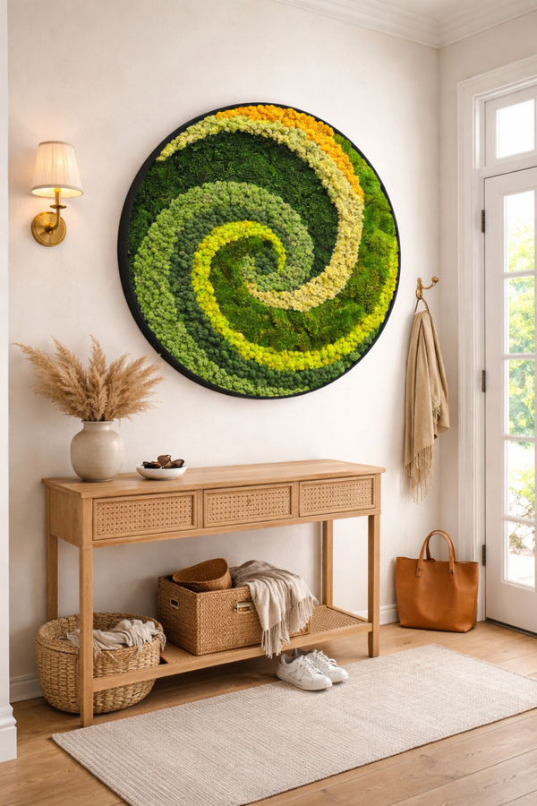 Hang ook een unieke moscreatie in houten cirkel aan jouw wand.