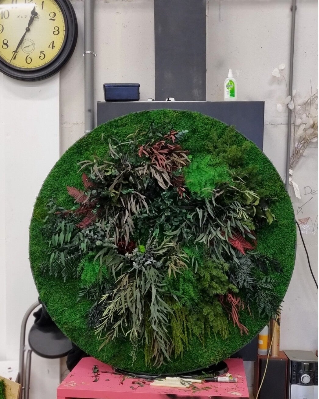 Deze moscirkel is van een platmos basis en met echte eucalyptussen en andere plantentakken. Er zitten rode accenten doorheen.